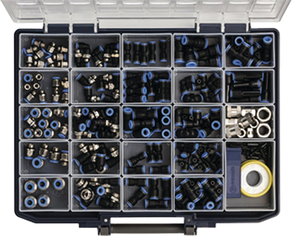 Blaue Serie · handliche, robuste und qualitativ hochwertige Kunststoff-Sortimentsbox mit den gängigsten Teilen unserer Schnellsteckverbinder »Blaue Serie« · insgesamt 31 verschiedene Sorten von Kleinteilen sind in 24 Kunststoffboxen übersichtlich präsentiert · die Einsätze können herausgenommen und in der Box selbst individuell platziert werden · alle Einsätze sind mit den Artikelnummern der beinhalteten Teile beschriftet