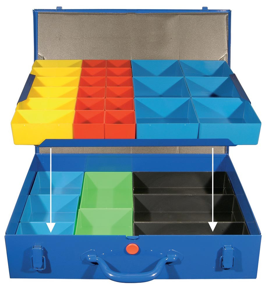 aus Stahlblech · Schaumstoffpresspolster im Deckel · ein Sicherheitsverschluss verhindert unbeabsichtigtes Öffnen · herausnehmbares, beschriftbares Fächersortiment · Systemfächer: