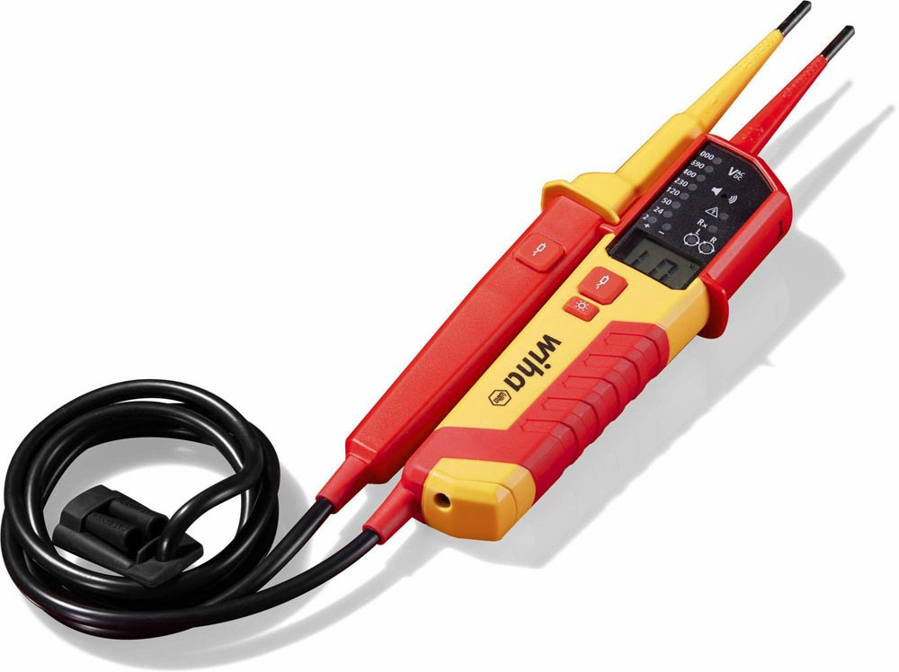 schnelle Einhandprüfung an Netzsteckdosen durch 19 mm Kontaktabstand · integrierte Taschenlampenfunktion sorgt für optimale Lichtverhältnisse. · Überprüfung der FI-Auslösung durch zwei Lasttasten · Spannungsprüfung im komfortablen Messbereich von 12 bis 1.000 V AC bzw. 1.500 V DC · zusätzlich bietet er die Möglichkeit der Durchgangsprüfung der optischen Drehfeldprüfung, der Einpolprüfung sowie der automatischen Polaritätserkennung · Messergebnisse sind dank einer LED-Anzeige einfach ablesbar ·ein zusätzlicher Signalton signalisiert den Stromfluss bei der Durchgangsprüfung · außerdem kann die Prüfung an Steckdosen komfortabel mit Hilfe des integrierten Abstandhalters einhändig durchgeführt werden · gleichzeitiges Drücken der Tasten an beiden Griffen der Prüfspitzen ermöglicht die Funktionsprüfung des FI-Schutzschalters durch das Zuschalten einer Last · gemäß den Messkategorien CAT III bis 1.000 V und CAT IV bis 600 V bietet der Spannungs- und Durchgangsprüfer maximale Sicherheit für Arbeiten im Bereich der Gebäudeinstallation sowie direkt an Quellen der Niederspannungsinstallation. IEC/EN 61243-3:2014 · IP64