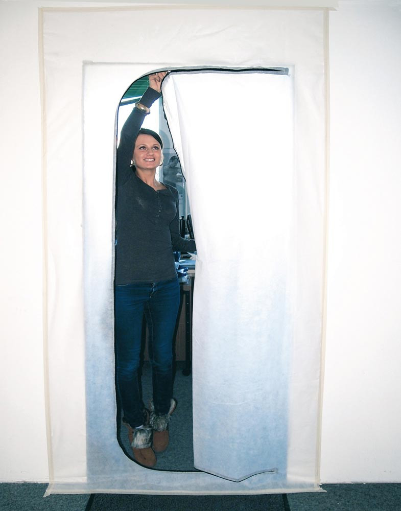 Gewebetuch (2,20 x 1,10 m) mit bereits eingenähtem Reißverschluss · Befestigung mit beiliegenden Klebeband (Rolle 7 m x 25 mm) · staubsichere Trennung von Wohn- und Baustellenbereich