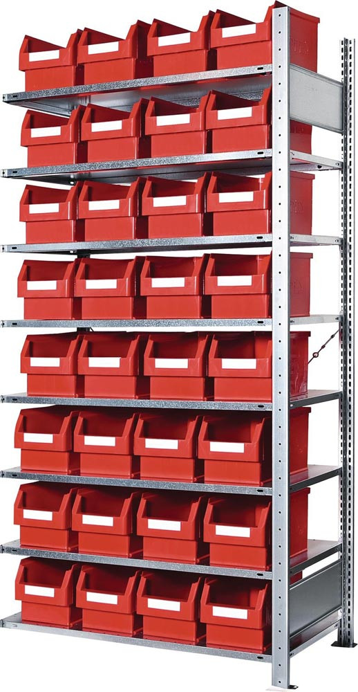 komplett mit Sichtlagerkästen Raster-Plan°· einfache und schnelle Steckmontage mit vormontierten verzinkten Rahmen · Fachböden verzinkt mit verstärktem Kastenprofil, H 25 mm, höhenverstellbar im 25-mm-Raster · Tragfähigkeit pro Fachboden 150 kg · Feldlast 1300 kg