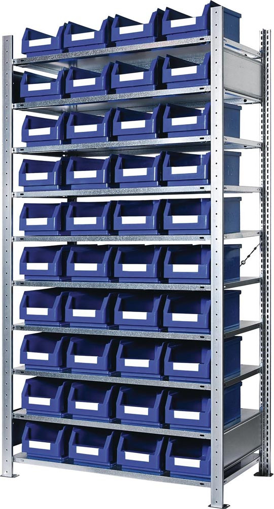 komplett mit Sichtlagerkästen Raster-Plan°· einfache und schnelle Steckmontage mit vormontierten verzinkten Rahmen · Fachböden verzinkt mit verstärktem Kastenprofil, H 25 mm, höhenverstellbar im 25-mm-Raster · Tragfähigkeit pro Fachboden 150 kg · Feldlast 1300 kg