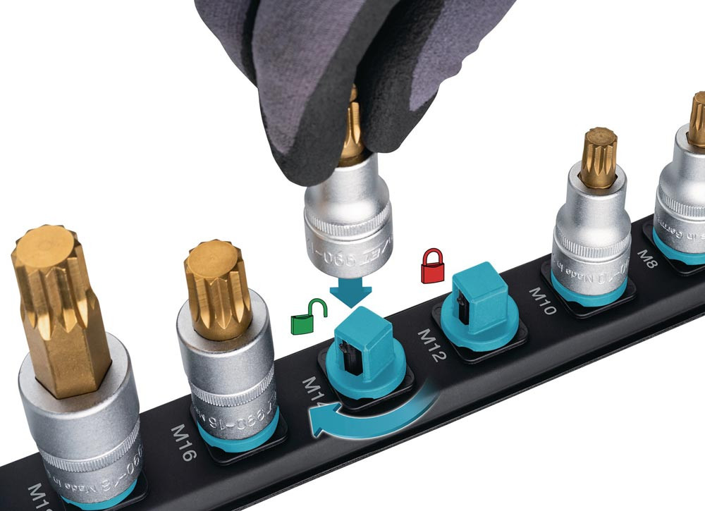 Anwendung: Flexible Kunststoff-Steckleiste mit 1⁄2″ Vierkantaufnahmen Magnetische Unterseite gewährleistet Halt auf allen eisenhaltigen Flächen · z.B. an Werkstattwagen · Werkzeugwänden · Maschinen · Hebebühnen und in Metallschubladen 5 Steckplätze ∙ leer Leicht zu reinigen Langlebige · robuste Drehverriegelung für festen Sitz und sofortigen Zugriff Sicherer fixiert im arretierten Zustand: zur Entnahme Steckschlüsseleinsatz nach links drehen Robuster Metallöse zum Aufhängen · z.B. an einem Haken 5 Steckplätze Antrieb: Vierkant hohl 12,5 mm (1/2 Zoll) Abmessungen / Länge: 245 mm x 37.4 mm Anzahl Werkzeuge: 5