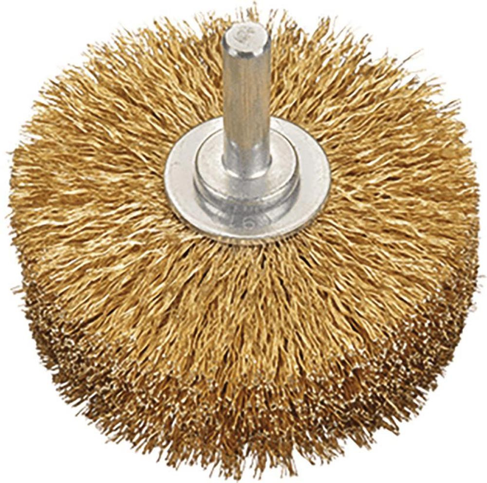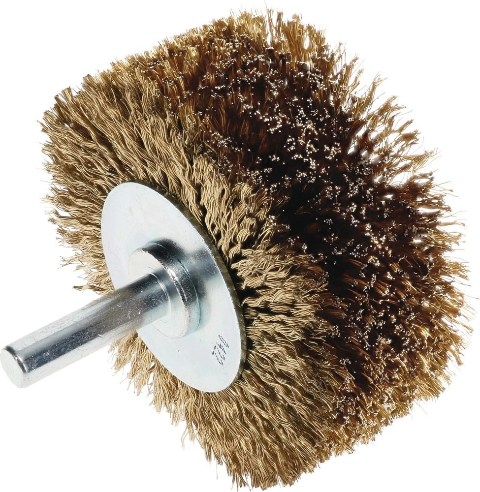Rundbürste mit Cordwire-Draht in Industriequalität für den Einsatz auf Bohrmaschinen · vermessingter, verseilter Stahldraht · effektive Holzbearbeitung · hoher Abrieb auf Weich- und Hartholz Durch große Arbeitsbreite für die Flächenbearbeitung geeignet · TÜV-Süd zertifiziert · Bauart geprüft · Produktion überwacht · hervorragend geeignet zum Strukturieren von Holz, dabei wird die natürliche Maserung des Holzes hervorgehoben und ein Antik- oder Rustikal-Effekt erzeugt · die Filamente der Bürste reiben die weicheren Stellen des Holzes mehr auf als die härteren, sie decken die Holzmaserung auf und hinterlassen eine Art Reliefoberfläche · Anwendung: zum Strukturieren von Holz