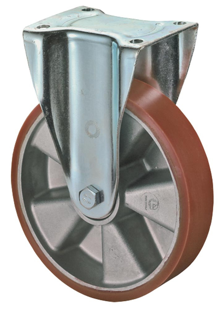Stahlblechgehäuse, verzinkt-chromatiert · Lauffläche aus Guß-Polyurethan, Härte 95 +/- 3 Shore A · Radkörper aus Aluminium, hohe Tragfähigkeit, minimaler Rollwiderstand · geräuscharmer Lauf, große Abrieb- und Reißfestigkeit, weitgehend beständig gegen Fette, Öle usw. · Arbeitstemperatur -20 °C/+ 80 °C · Kugellager · mit Plattenbefestigung