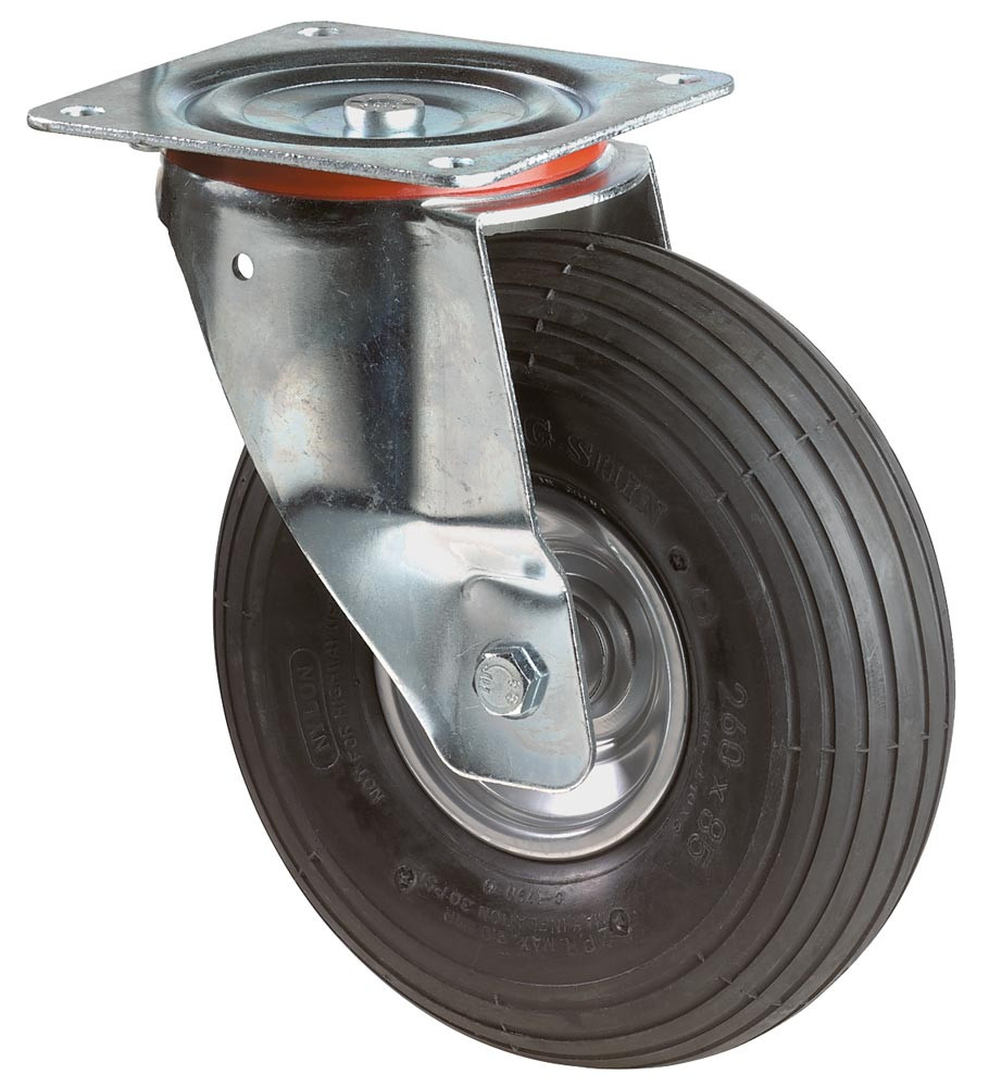 Lenkrolle · Gehäuse aus Stahlblech, verzinkt-chromatiert mit Luftbereifung auf Stahlfelge, Gummi (schwarz) · zweireihiger Kugelkranz im Gabelkopf · Rollenlager + Rillenprofil · mit Plattenbefestigung · Stoßdämpfung, bodenschonend