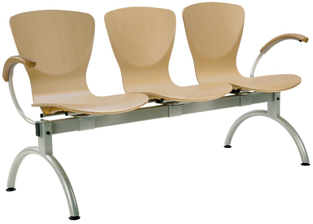 ∙ Mit 2,3 oder 4 Sitzelementen ∙ Integrierter Ablagetisch ∙ Tischplatte in Buchedekor mit ABS-Umleimer ∙ Traversengestell aus rundem Stahlrohr, Stahlprofil 60 x 30x 3 mm RAL 9006 weißaluminium ∙ Kunststoffgleiter ∙ Sitzschalen aus 8-lagigem Buchenschichtholz, Stärke 11,5 mm ∙ Traversenbänke aussen mit festen Armlehnen