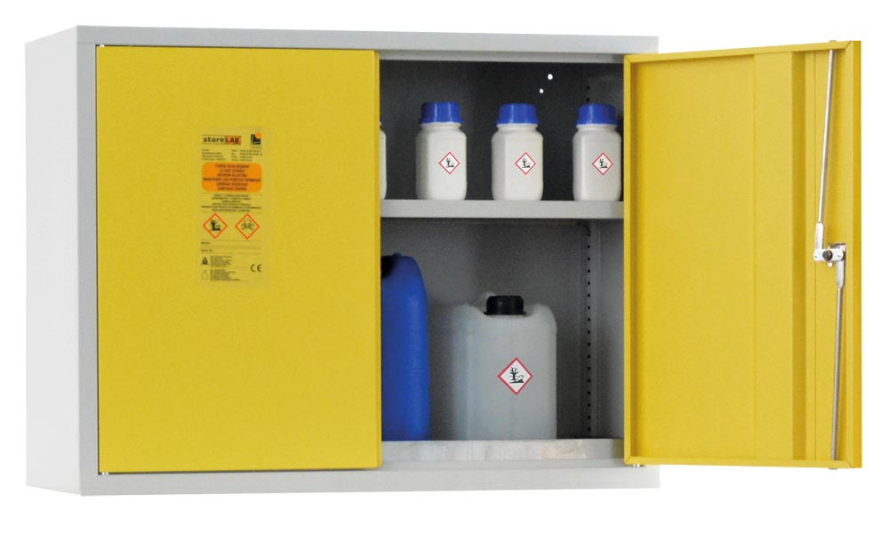 · Zur Lagerung wassergefährdender Gefahrstoffe in Kleingebinden im Gebäude · Verstärkte Tür mit Zylinderschloss · Aus Qualitätsstahlblech in einwandiger Bauweise · 1 höhenverstellbarer Fachboden, pulverbeschichtet RAL 7035 Lichtgrau · 1 Auffangwanne aus 3 mm verzinktem Stahlblech mit Ü-Zeichen gemäß StawaR · Traglast 25 kg/Schrank · Platzsparend montierbar inkl. Montagematerial · Korpus pulverbeschichtet in RAL 7035 Lichtgrau, Tür in RAL 1018 Zinkgelb