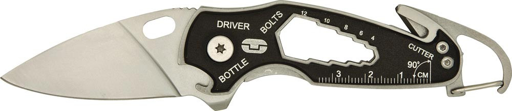 aus 420iger Edelstahl · universelle Schraubenschlüssel · Schraubendreher · Gurtschneider · "Nothammer" · Flaschenöffner · Gürtelclip