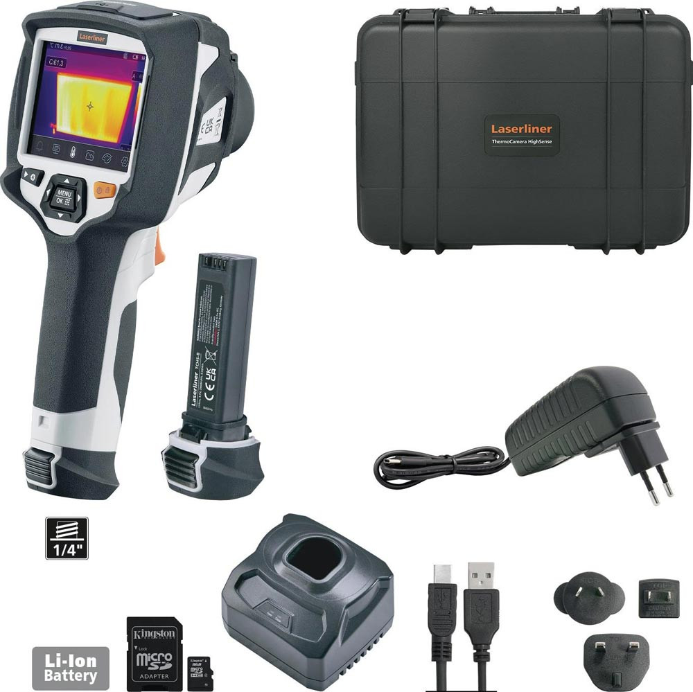 Lieferumfang: ThermoCamera HighSense, 2 x Li-Ion Akkupack, Ladeschale mit Netz-Ladegerät und internat. Adaptern, USB-Kabel, 8 GB Micro-SD-Karte mit Adapter, Tragekoffer