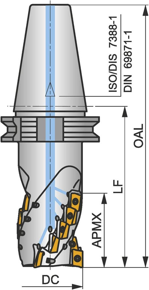 Walzenstirnfräser mit positiver/negativer Geometrie zum spannen von 32 Stück ADMX 16 oder ADEX 16 einseitigen Wendeschneidplatten · Schnittdurchmesser 80mm mit 90° Anstellwinkel und SK 50 Kegelschaft gemäß ISO/DIS 7388-1 · 108mm Funktionslänge 257mm Gesamtlänge · Kühlkanalbohrung und ungleiche Teilung zum tiefen Schulterfräsen und tiefen Nutfräsen mit einer maximalen Schnitttiefe von 108mm