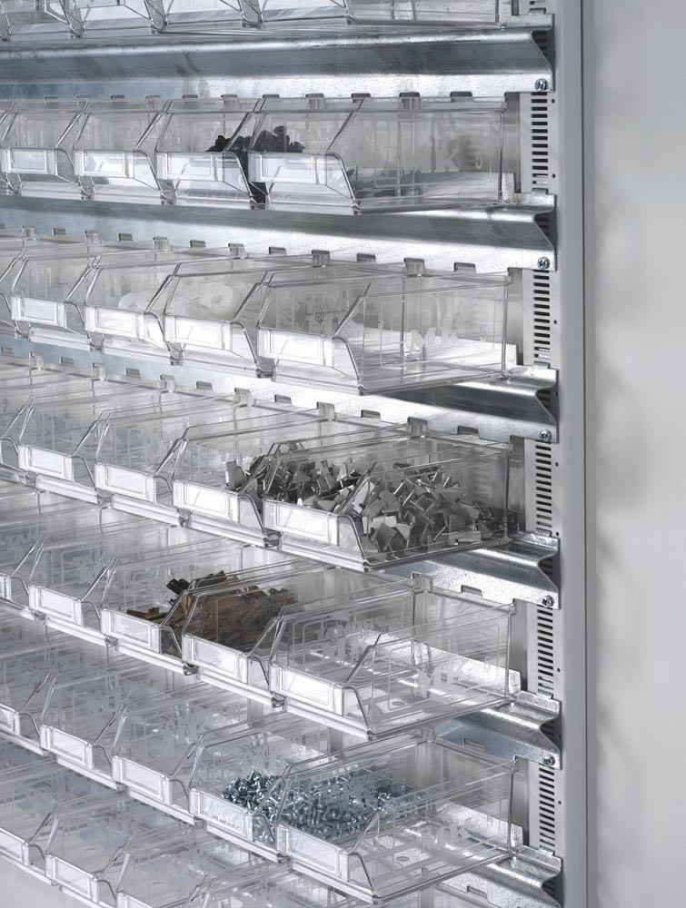 Wandsystem H1000xB1010mm Stahl verzinkt mit Sichtlagerkästen 45 x MK5, 12 x MK4 transparent