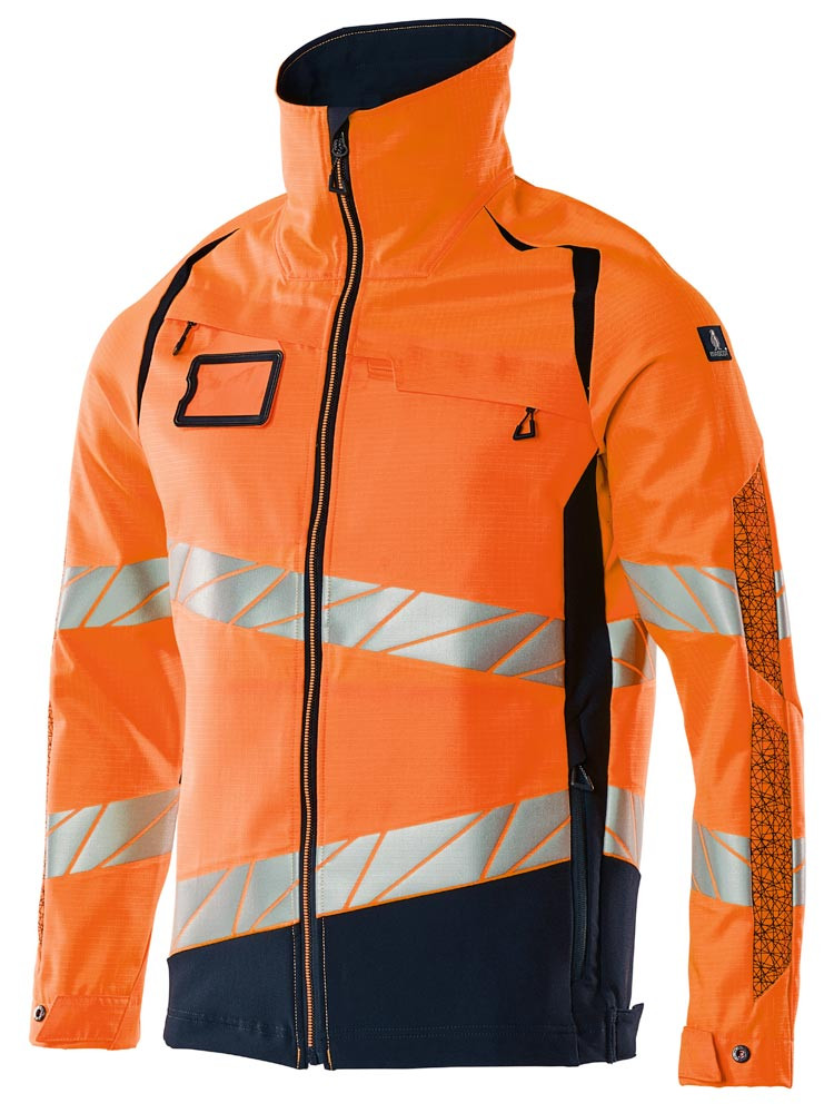 Nach EN ISO 20471 - Klasse 2, Hi-Vis Gruppe A und ProWash® ∙ Aus 70% Polyester/30% Baumwolle, ca. 215 g/m2 ∙ Fluoreszierende Kontrastfarbe mit Reflexstreifen ∙ Zweifarbig ∙ Teile des Produktes sind aus Stretchstoff ∙ Kombination der leichten Stoffqualität 236 und ULTIMATE STRETCH Stoffqualität 511 ∙ Stehkragen ∙ Verschluss mit Reißverschluss und inwendiger Wetterschutzleiste ∙ D-Ring ∙ Brusttasche und Vordertaschen mit Reißverschluss ∙ Innentaschen ∙ Gummizug in der Unterkante an den Seiten und an den Handgelenken ∙ Druckeffekte ∙ Für Industriewäsche-Kategorie B1 geeignet ∙ Zertifiziert nach OEKO-TEX Standard® 100