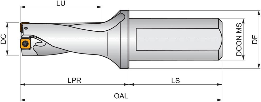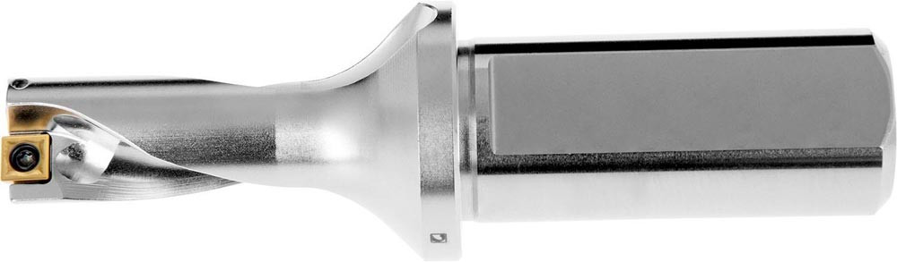 Wendeschneidplattenbohrer zum einsetzen von einer XPET 0602.. Wendeschneidplatten als Zentrumschneide und einer SCET 0502.. Wendeschneidplatte als Außenschneide · Bohrdurchmesser 0.750'' · mit einem 1.000'' abgeflachten Zylinderschaft nach ISO 9766 und Innenkühlung für maximale Bohrtiefen bis 2 x D