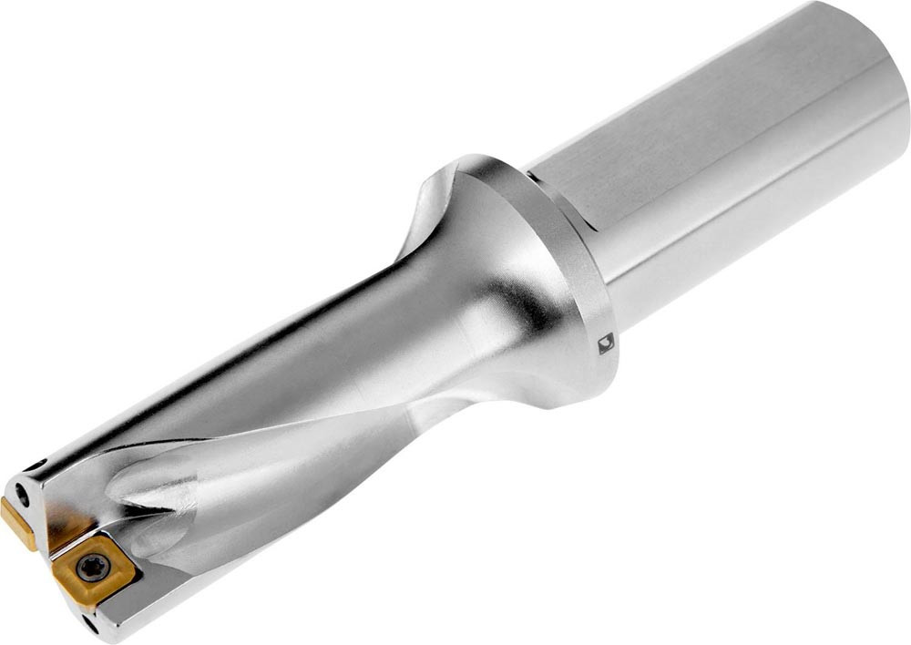 Wendeschneidplattenbohrer zum einsetzen von einer XPET 0703.. Wendeschneidplatten als Zentrumschneide und einer SCET 0703.. Wendeschneidplatte als Außenschneide · Bohrdurchmesser 1.000'' · mit einem 1.250'' abgeflachten Zylinderschaft nach ISO 9766 und Innenkühlung für maximale Bohrtiefen bis 2 x D