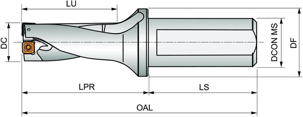 Wendeschneidplattenbohrer zum einsetzen von einer XPET 0502.. Wendeschneidplatten als Zentrumschneide und einer SCET 0502.. Wendeschneidplatte als Außenschneide · Bohrdurchmesser 15mm in Kombination mit EP253253 · geeignet für eine radiale Verstellung von -0.25 bis +0.35mm · mit einem 25mm abgeflachten Zylinderschaft nach ISO 9766 und Innenkühlung für maximale Bohrtiefen bis 2 x D