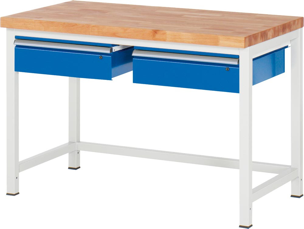 Werkbank, BxTxH 1250x700x840-1040 mm, 2 Schubladen 150 mm, Platte Buche 40 mm, RAL 7035/5010