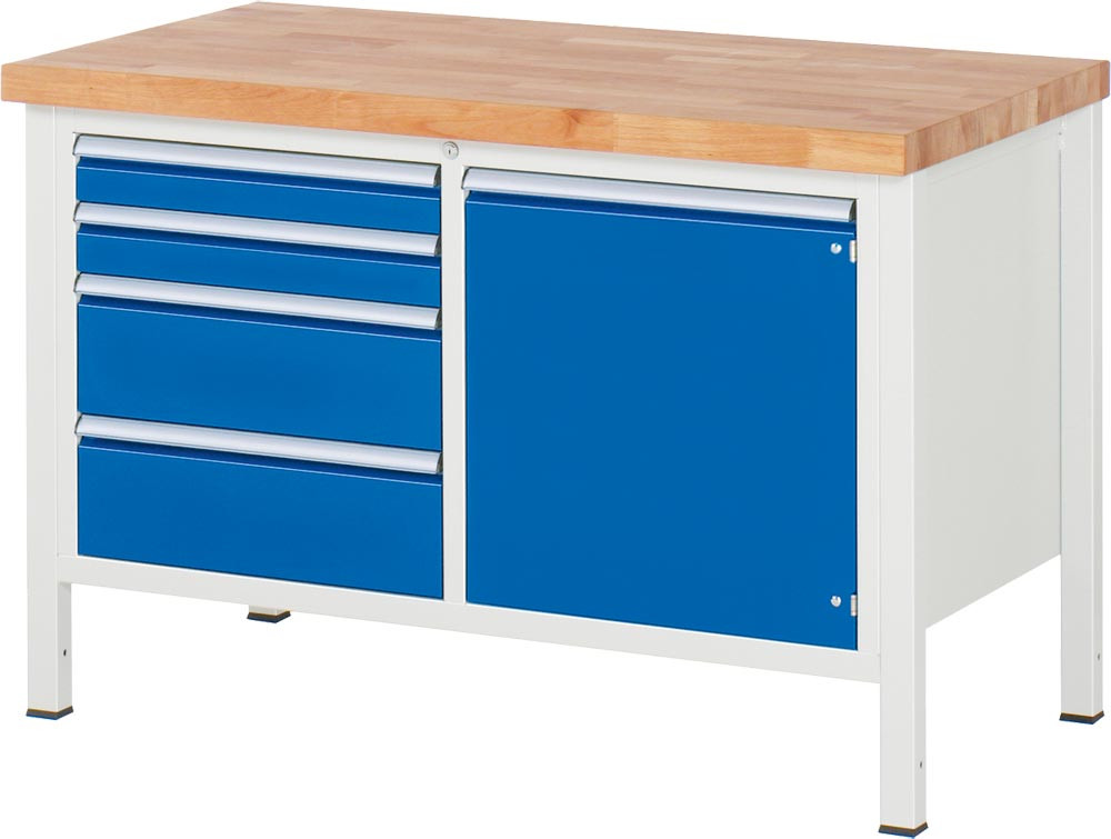 Werkbank, BxTxH 1250x700x840-1040 mm, Platte Buche 40 mm, 4 Schubladen: 2x120/2x150 mm, 1 Tür 540 mm, 1 Fachboden, RAL 7035/5010