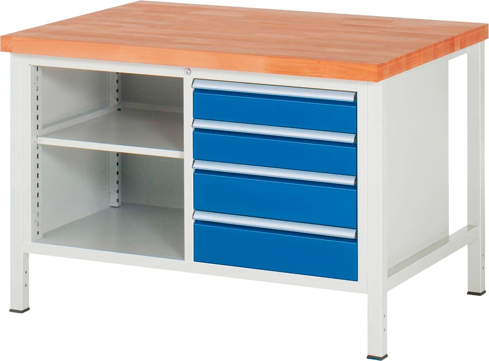 Werkbank, BxTxH 1250x900x840-1040 mm, Platte Buche 40 mm, 4 Schubladen: 2x120/2x150 mm, 1 Fachboden, RAL 7035/5010