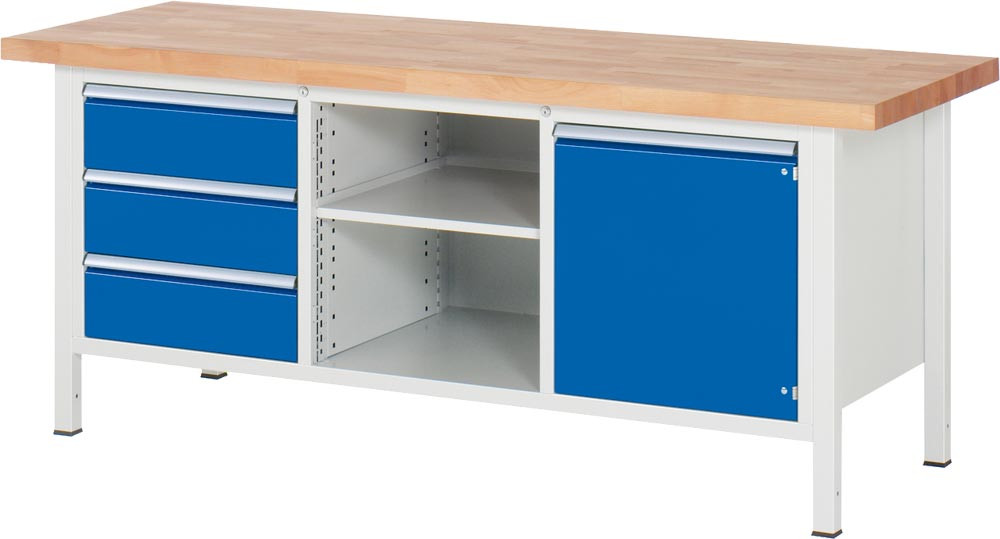 Werkbank, BxTxH 2000x900x840-1040 mm, 2 Schubladen 180 mm, 2 Türen 360 mm, 2 Böden, Platte Buche 40 mm, RAL 7035/5010