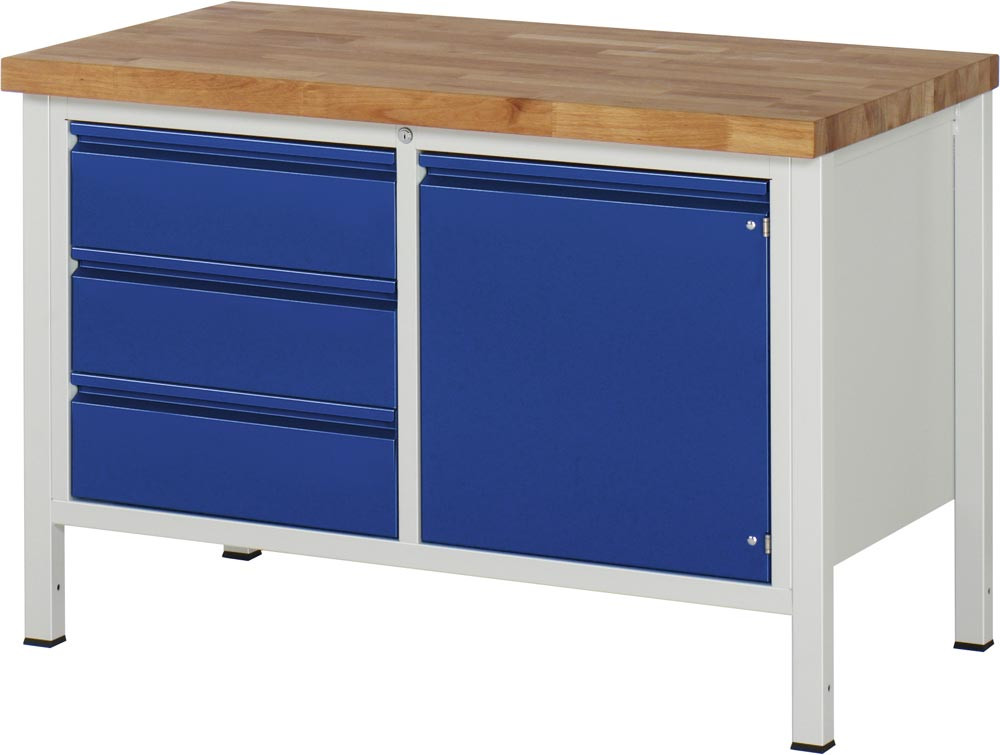 Werkbank, Platte Buche 40 mm, BxTxH 1500x700x840 mm, 3 Schubladen 180 mm, 1 Tür 540 mm, 1 Fachboden, RAL 7035/5010