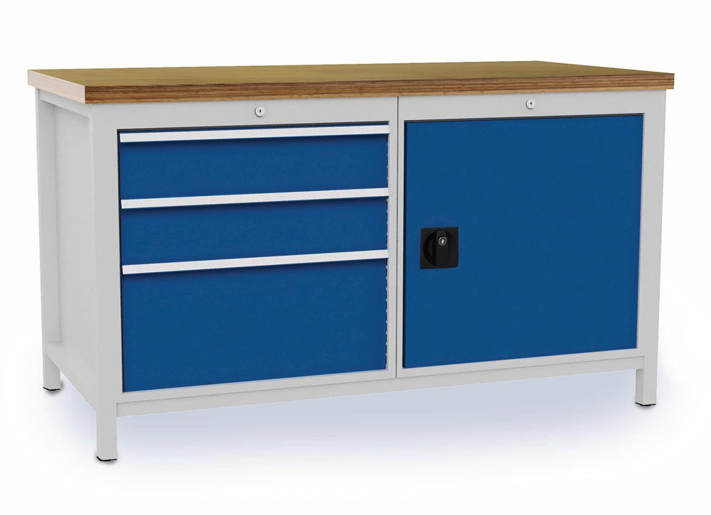 Werkbank signalblau lichtgrau B1500xH859xT750 mm Buche Multiplex 40 mm 3 Schubladen 1 Türen