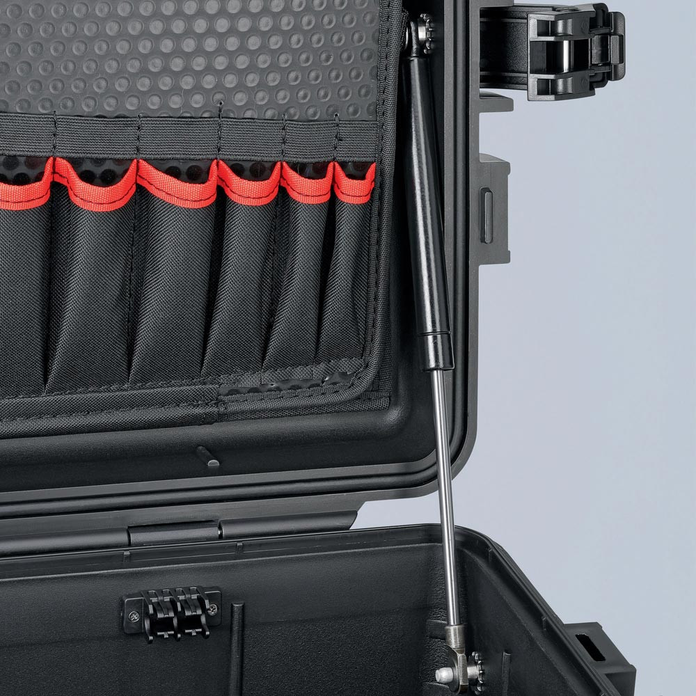 Staub- und wasserdicht · flugtauglich · aus schlagfestem Polypropylen · automatisches Druckausgleichventil · Temperaturstabil von - 30°C bis + 80°C · Vorrichtung für Vorhängeschloss (gehört nicht zum Lieferumfang) · Dokumentenfach · Werkzeugtafeln aus Con-Pearl® mit 54 bestückbaren Werkzeugtaschen und 94 Werkzeugschlaufen · verschließbare Bodenschale (individuell unterteilbar durch Aluminium-Trennstegesystem) · Zweikomponenten-Griff · integriertes Fahrgestell mit zwei leicht laufenden Rollen und Teleskopgriff · Volumen 45 Liter · max. belastbar bis 35 kg