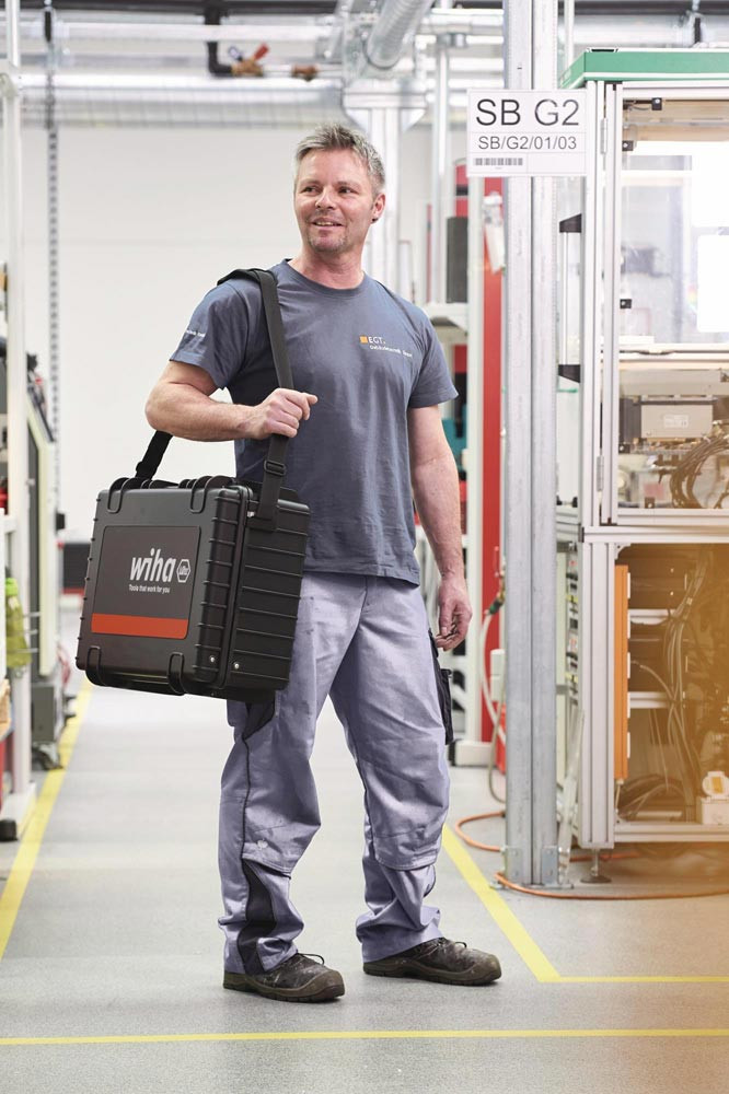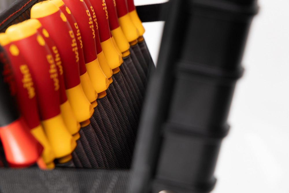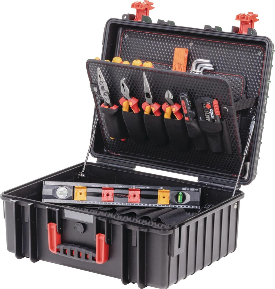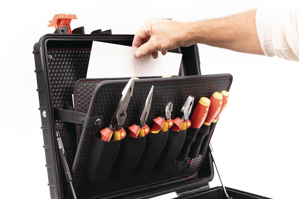 für die Elektroinstallation · viel zusätzlicher Stauraum mit individualisierbarer Bodeneinteilung · 71 Schlaufen und Dokumentenfach · bequemer Werkzeugtransport dank gepolstertem und einstellbarem Tragegurt · schützt die Finger bei zufallendem Kofferdeckel dank Gasdruckdämpfer · übersichtliche Organisation für müheloses Entnehmen der Werkzeuge · isolierte Werkzeuge geprüft gemäß IEC 60900