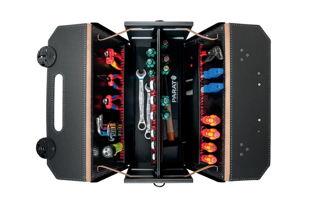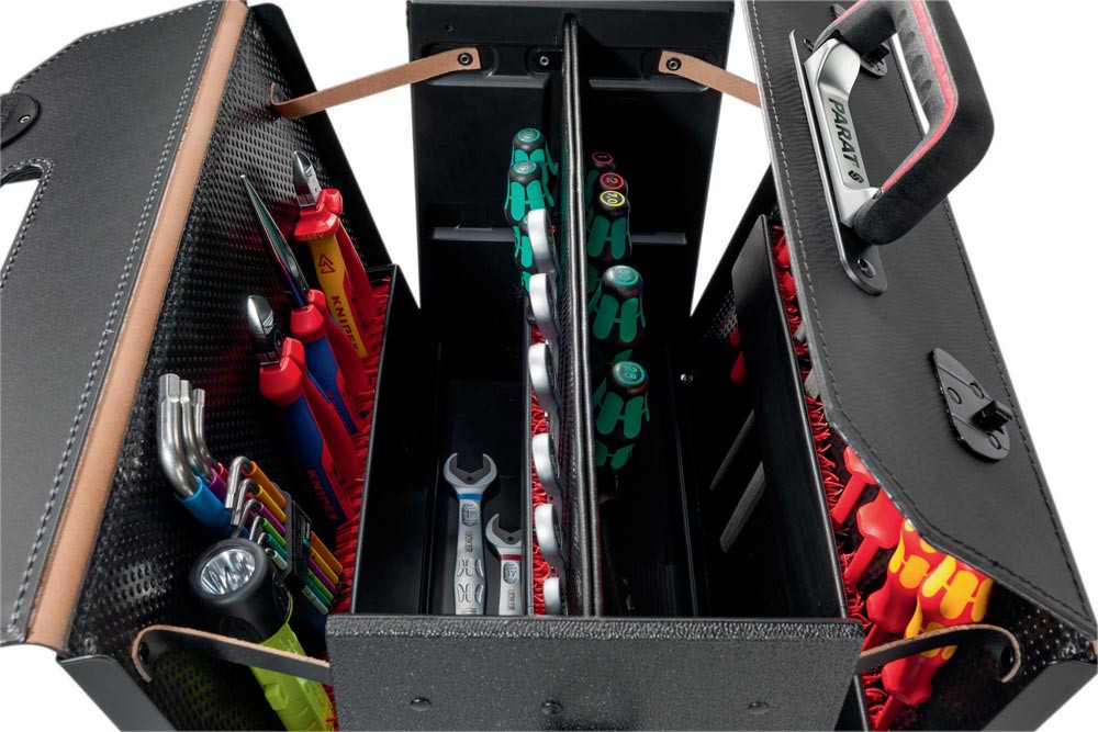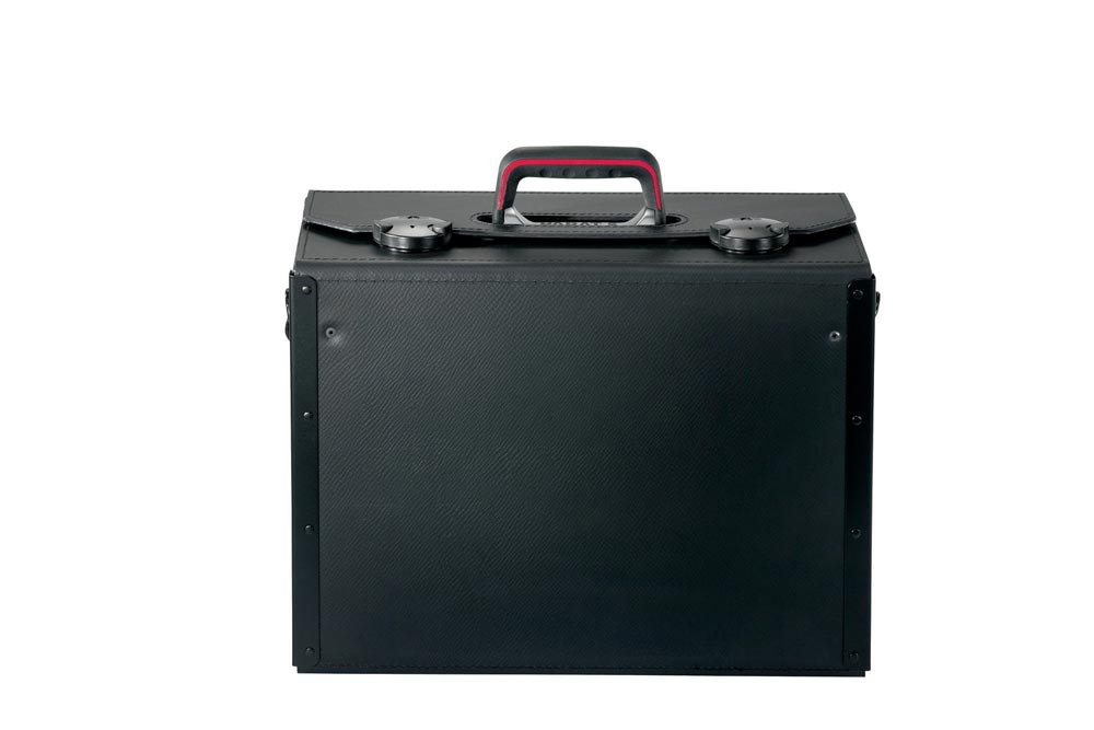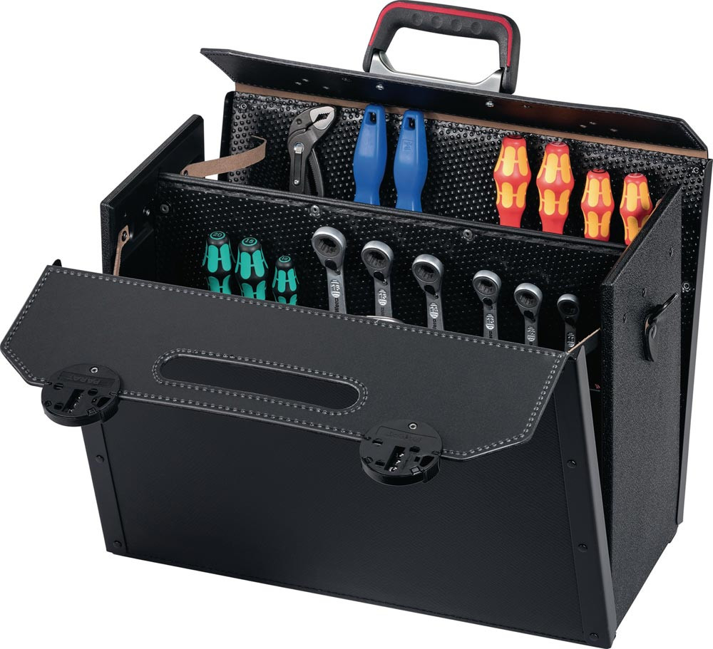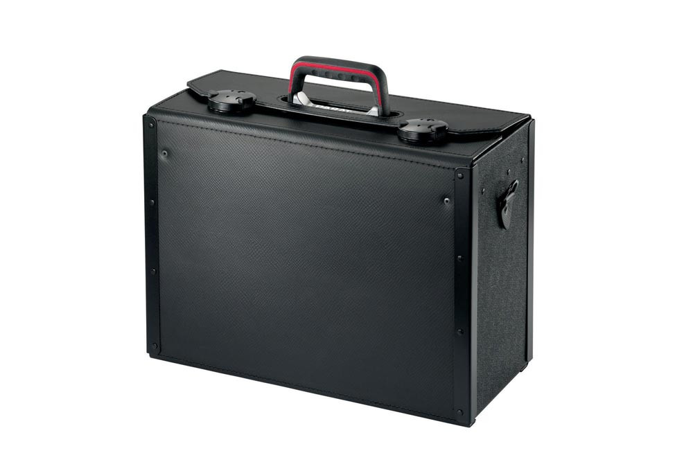 aus Rindsleder · schwarz · Vorder- und Rückwand teilaufklappbar · Griff mit gepolsterten Griffmulden und stabiler Metallgriffschiene · Bodengleiter · fixierte Mittelwand · flexible CP-7 Stecksysteme ermöglichen die individuelle Bestückung mit Werkzeugen bis Ø 26 mm · abschließbare Rasterschlösser, Ringkappen, Griffloch · CP-7 Stecksystem: Mit diesem System kann der Werkzeugkoffer individuell bestückt werden · die Werkzeuge bleiben immer an ihrem Platz, selbst bei Öffnung kopfüber · geeignet für die Aufnahme von Werkzeugen mit einer Stärke bis max. 26 mm