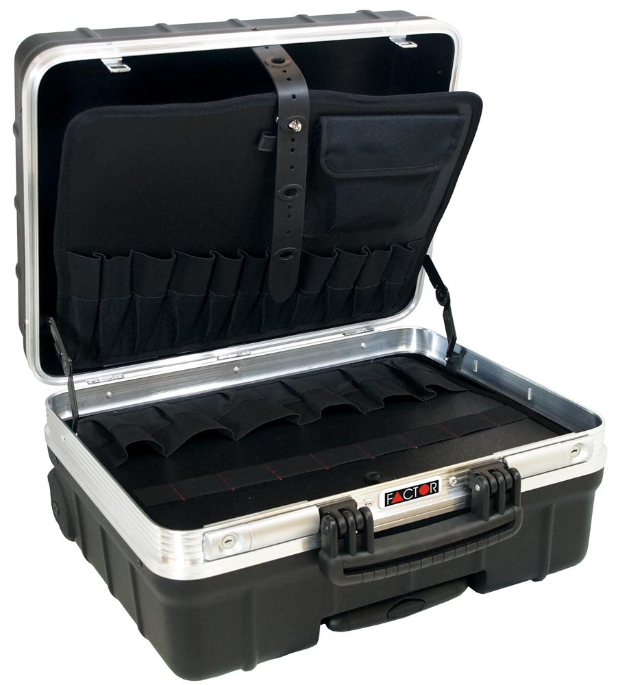 Ausführung: Kofferschalen aus Polypropylen, schwarz ∙ Schlagunempflindlich bei hohen Temperaturschwankungen ∙ Umlaufender Aluminium-Rahmen ∙ Herausnehmbare Werkzeugtafeln ∙ Werkzeugtafel beidseitig bestückbar mit 24 Einsteckfächern und 12 Gummilaschen, großer Tasche ∙ Werkzeugtafel einseitig bestückbar im Bodenfach mit 6 Einsteckfächern und 9 Gummilaschen ∙ Bodenschale einteilbar mit 3 Trennstegen mit Abdeckplatte ∙ Mit leichtgängigen Rollen und Teleskopgriff