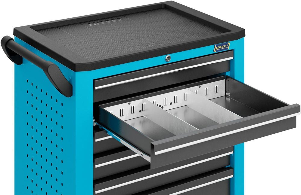 Anwendung: Effiziente · mobile Organisation von Werkzeug. Werkzeug- · Material- und Montagewagen. 5 flache und 2 hohe Schubladen. Komplett mit 147-teiligem Werkzeug Sortiment in Safety-Insert-System Weichschaumeinlage. Hohe Flexibilität. Griff und Rollen wahlweise links oder rechts montierbar. Praktisches HAZET Design. Griffleisten für angenehme Haptik. Kunststoffhaube mit Texturen und großer vertiefter · komplett nutzbarer Arbeitsfläche. Komplett abgedichtete Arbeitsfläche schützt Wageninneres bei auslaufenden Flüssigkeiten. Abgeschrägte Kanten vermeiden Beschädigungen. Zahlreiche Befestigungsmöglichkeiten. Zubehör · wie z. B. HAZET Papierkorb · Dosenhalter an linker und rechter Seite montierbar. Rückwärtige Schraubpunkt zur Montage von weiterem Zubehör. Arbeitsflächen. Deutlich vergrößerte Ablage- und Arbeitsfläche in Kunststoff. Modernes Oberflächendesign der Arbeitsfläche. Lösemittelbeständige Arbeitsfläche schützt Wageninneres bei auslaufenden Flüssigkeiten. Umrandung der Arbeitsfläche schützt Teile vor Herabfallen. Korpus / Fahrgriff. Extrem robuste Ausführung durch doppelwandige Konstruktion. Komplette Schweißkonstruktion des ganzen Korpus für den täglichen harten Werkstatteinsatz. Individuelle Befestigungsmöglichkeiten durch Quadrat-Lochraster auf Seitenwänden · z. B. für HAZET Hakenprogramm Artikelgruppe 112 für Werkzeuge oder andere Anbauteile wie z. B. Dosenhalter · Papierrollenhalter · Papierkorb · etc.. Stabiler Fahrgriff beidseitig fest am Korpus montierbar. Verriegelungs-Konzept. 2-stufige VerriegelungZentralverriegelung · abschließbar durch Zylinderschloss mit 2 Knickschlüsseln. Gegenseitige Auszugssperre für minimales Kipprisiko. Schubladen-Konzept. Gegenseitige Verriegelung der Schubladen verhindert ungewolltes Öffnen. 100 % Auszug mit Rollenführungen. Schubladendesign zur optimalen Nutzung des Innenraums. Schubladenfronten für optimiertes Handling. Schmutzunempfindliche Schubladen-Beschichtung zur einfachen Reinigung. Hochleistungs-Fahrwerk. Große stark belastbare Räder mit Präzisionskugellager und zweifachem Kugelkranz im Schwenklager · einfaches Bewegen auch bei hoher dynamischer Last. 2 Lenkrollen mit Doppelstopp: Gebremste Rollen verhindern Wegrollen. Gebremste Schwenklager verhindern Drehen der Lenkrollen · z. B. auf schrägen Flächen. Schutzring verhindert Eindringen von Schmutz und Fäden. Elastikrollen ermöglichen ruhigen Lauf. Gesamttragkraft (dynamisch): 480 kg. Gesamttragkraft (statisch): 480 kg. Traglast hohe Schublade: 20 kg. Farbe: HAZET blau. Maße: 780 mm x 498 mm x 1018 mm. (Schubladen)größe für Ordnungssystem: 3/3. Höhe Arbeitsfläche: 1002 mm. Anzahl Bockrollen: 2 (∅ 125 mm). Anzahl Lenkrollen: 2 (∅ 125 mm). Anzahl Werkzeuge: 147.