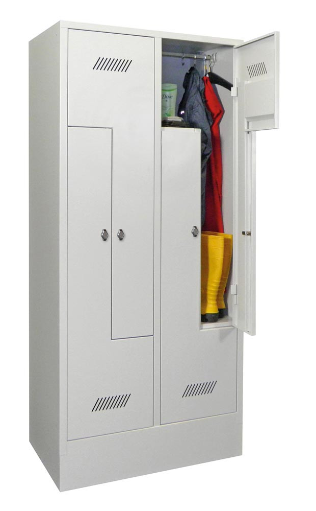 Z-Garderobenschränke finden überall dort Verwendung, wo der Platz nur für einen Garderobenschrank mit 2 Abteilen übereinander ausreicht, aber trotzdem längere Kleidungsstücke untergebracht werden müssen.