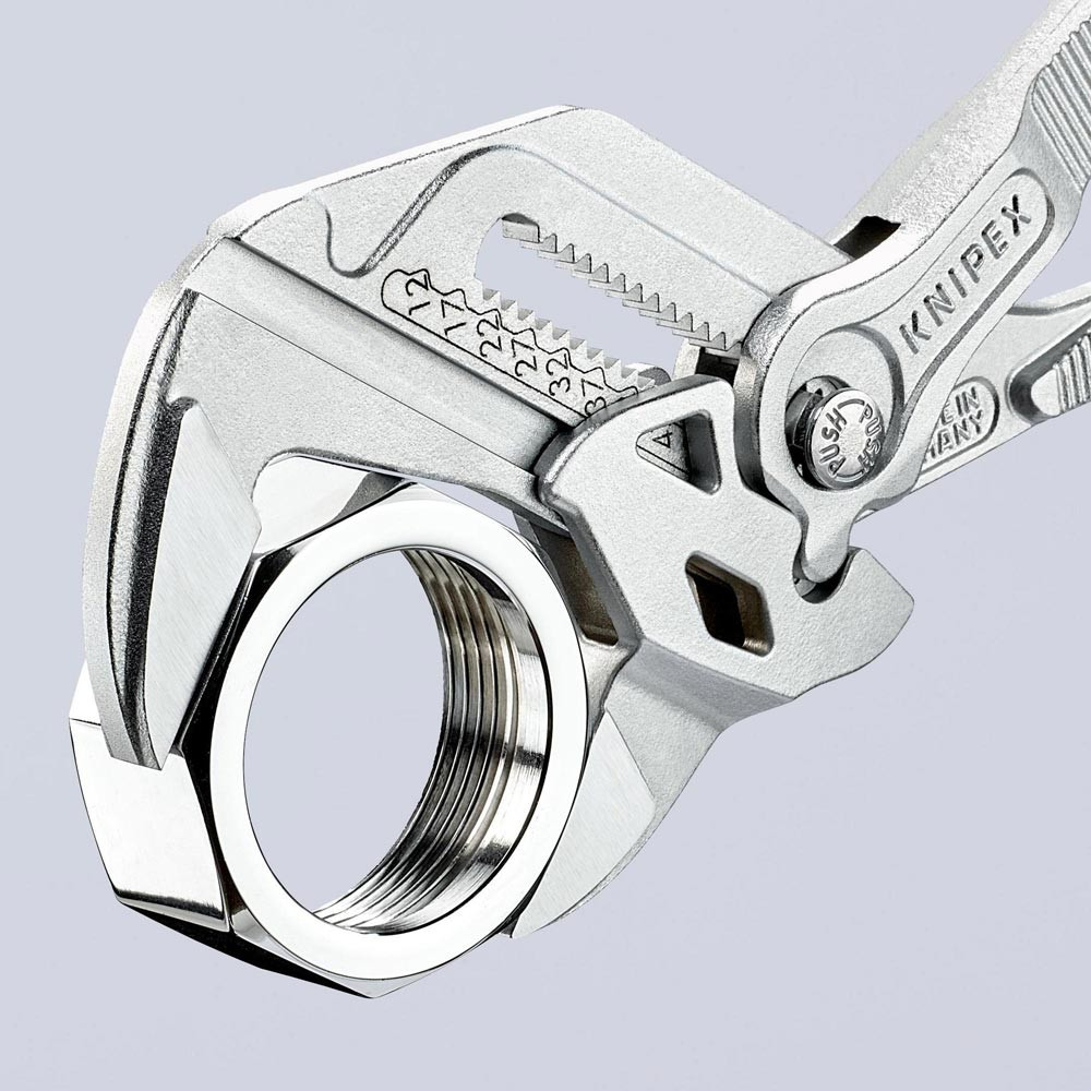 ersetzt einen Satz Schraubenschlüssel, metrisch wie zöllig · glatte Backen für die schonende Montage von oberflächenveredelten Armaturen · Arbeiten direkt auf Chrom · Schnellverstellung per Knopfdruck · Chrom-Vanadin-Elektrostahl, geschmiedet, ölgehärtet