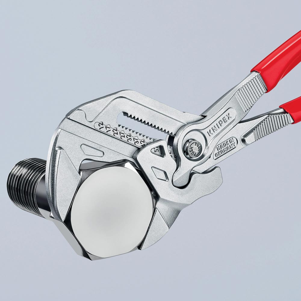 ersetzt einen Satz Schraubenschlüssel, metrisch wie zöllig · glatte Backen für die schonende Montage von oberflächenveredelten Armaturen · Arbeiten direkt auf Chrom · Schnellverstellung per Knopfdruck · Chrom-Vanadin-Elektrostahl, geschmiedet, ölgehärtet